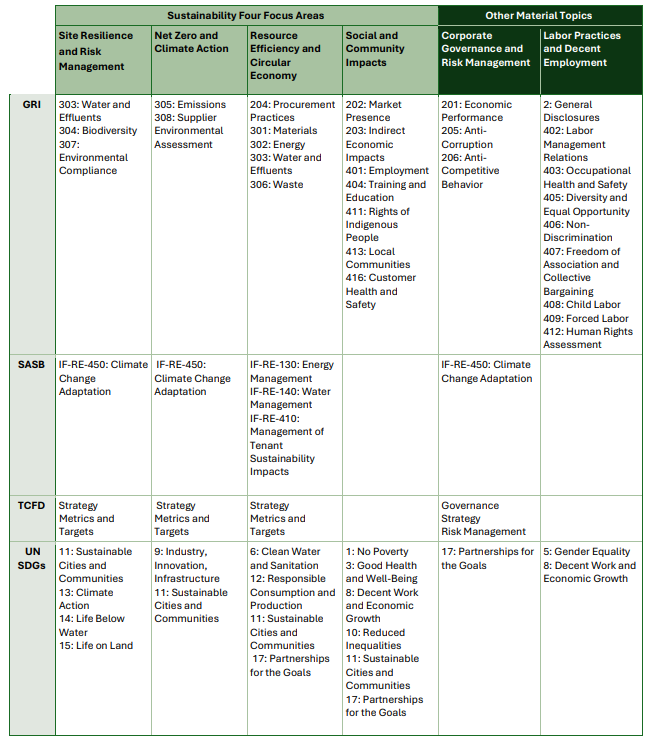 To measure Ayala Land’s performance and report its impact on local and global development, Ayala Land identified UN SDGs and GRI, SASB and TCFD topics that correspond to the four focus areas and other material topics.